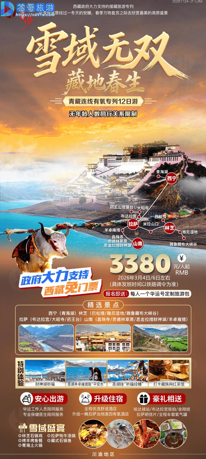 雪域无双-青藏连线有氧专列11/12日游 答哥华运 2025-12-04 生成海报 生成海报 专列 青海 西藏 西宁 拉萨 林芝 山南 加入收藏 上一条:花江大峡谷大桥/九洞天真纯玩3日游 下一条:东西南北疆极致温情空调专列13日游 您可能还会对下面的信息感兴趣: 随便看看 挺进大别山会师天堂寨动卧七日游 山西全景双飞8日游